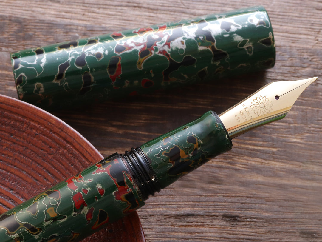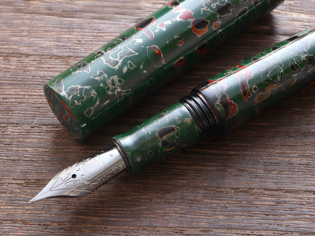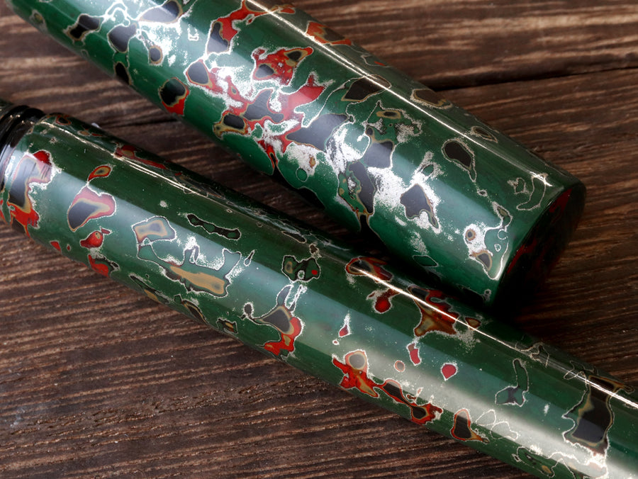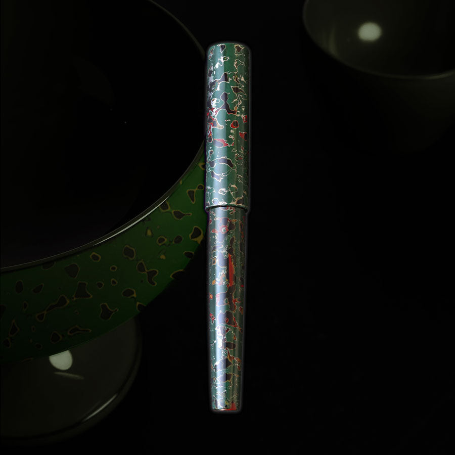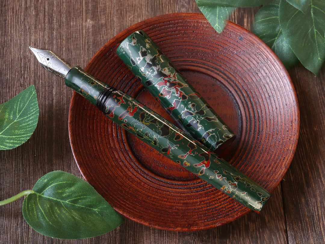 Sekai Tsugaru fountain pen is crafted with Kara-nuri - a high-quality Tsugaru-nuri technique that illustrates distinctive speckled patterns created by four to six different Urushi color lacquers. With this technique, many layers of different Urushi are applied unevenly to wooden or ebonite surface. After a long period of 3-4 months when Urushi lacquer is dry, artisans will start polishing to even the surface. The final finish will then become smoothly glossy and show the mottled patterns. The whole process takes 6-7 months and is totally done by hands.