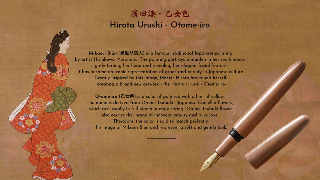 Mikaeri Bijin (見返り美人) is a famous traditional Japanese painting by artist Hishikawa Moronobu. The painting portrays a maiden in her red kimono, slightly turning her head and revealing her elegant facial features. It has become an iconic representation of grace and beauty in Japanese culture. Greatly inspired by this image, Master Hirota has found herself creating a brand-new artwork - the Hirota Urushi - Otome-iro.