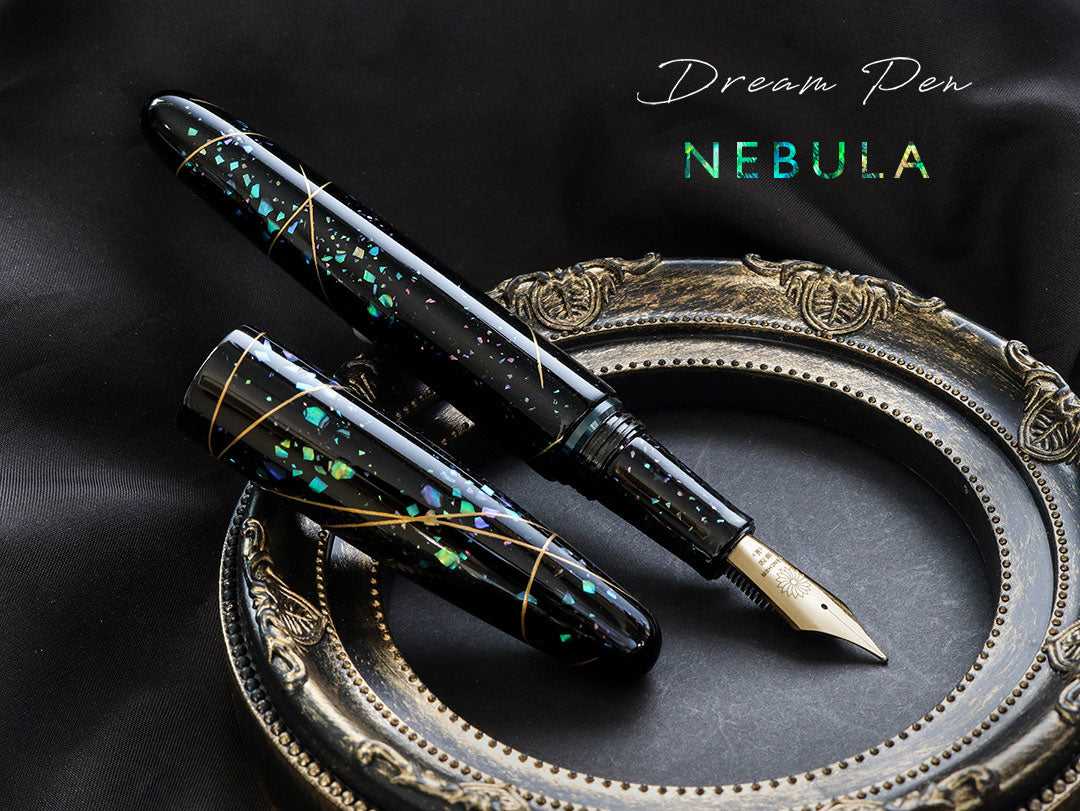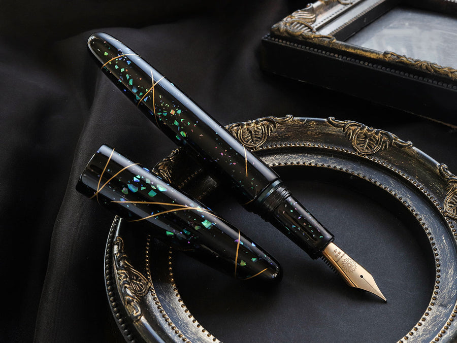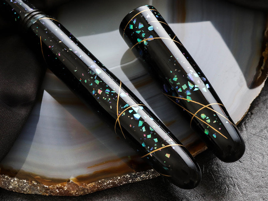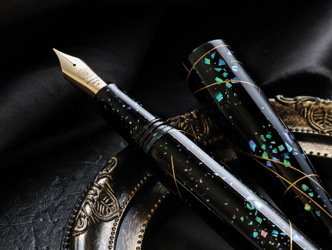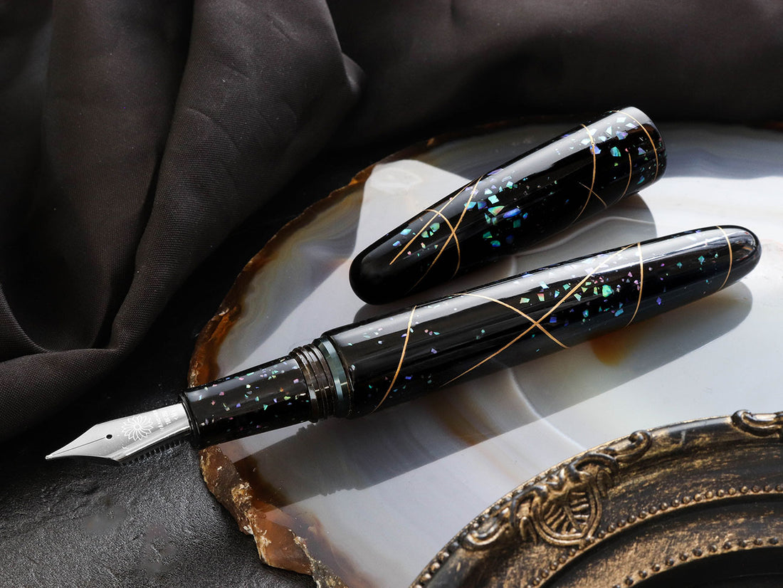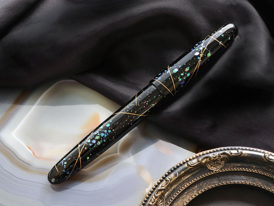 Especially, the highest-class model - "Supernova" - features a complicated Maki-e technique - Nashiji 梨子地 or pear-skin ground, beautifully embracing two opposite sides of the ebonite pen body.