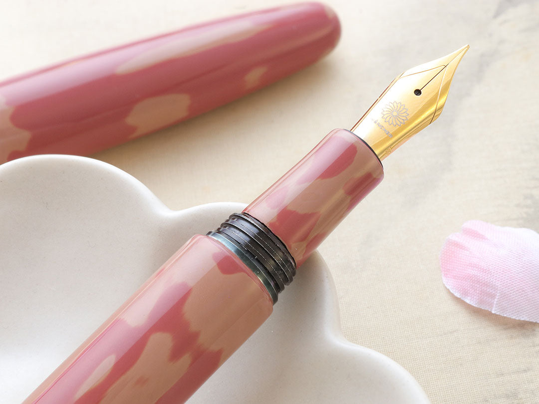 Multiple thin layers of natural, white lacquer (Urushi) is applied as a base onto the fountain pen. After a significant period of time, authentic cherry-colored lacquer is applied on top of these layers, which is thoroughly polished after drying to reveal the layers of white Urushi in a completely unique and un-repeatable pattern. Through this complicated method, we are able to evoke the unmistakable, impossible to recreate vision of flowers floating on a river. Due to the difficulty of the handcrafting process, only one piece exists with this design.