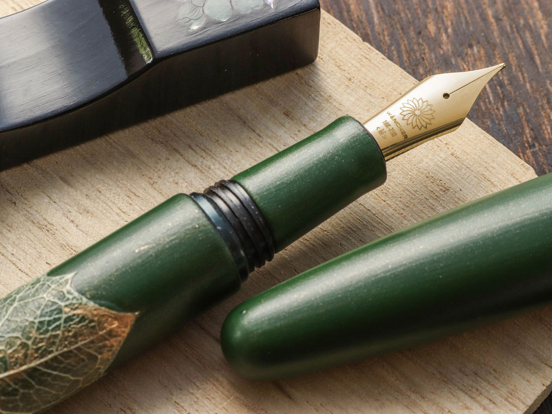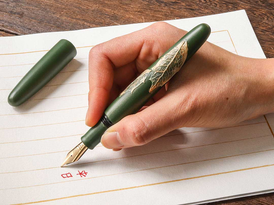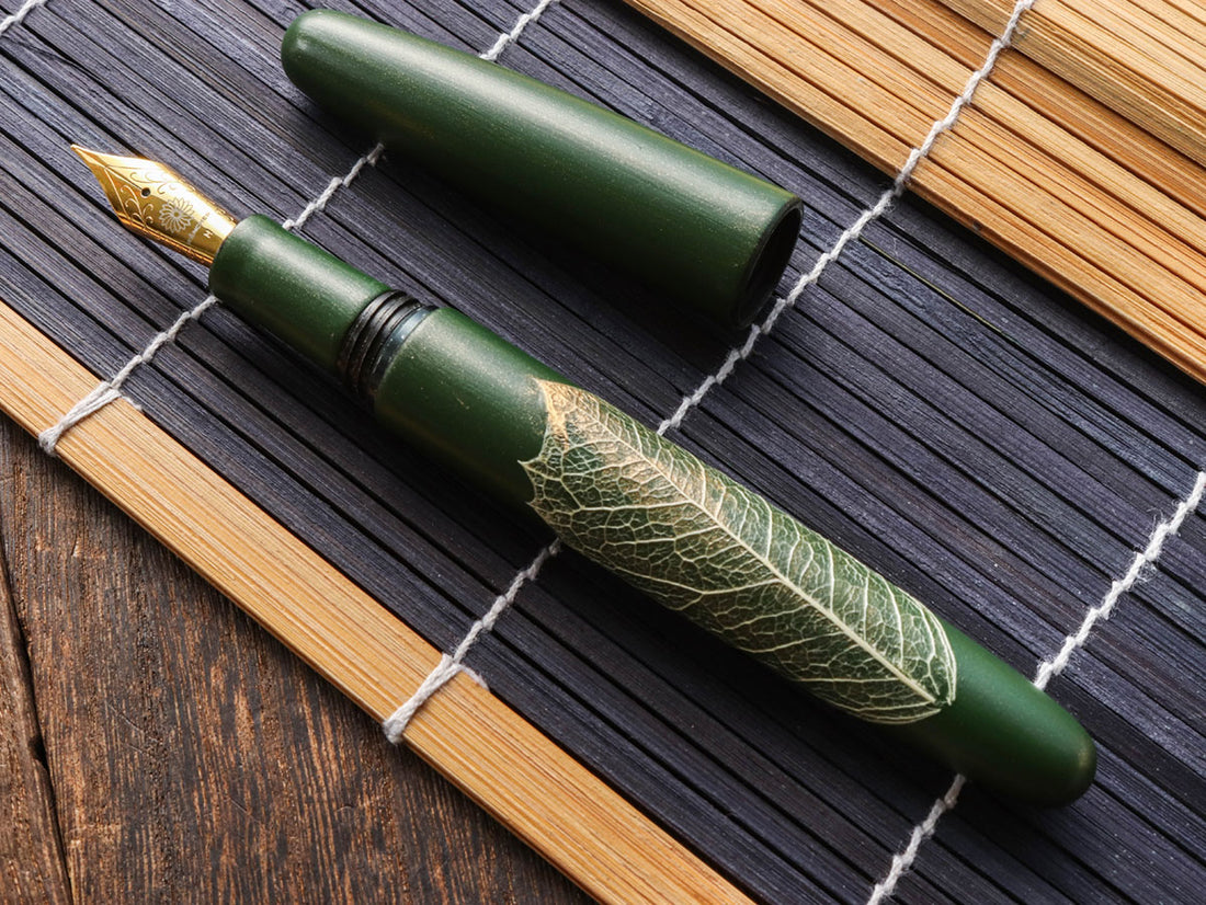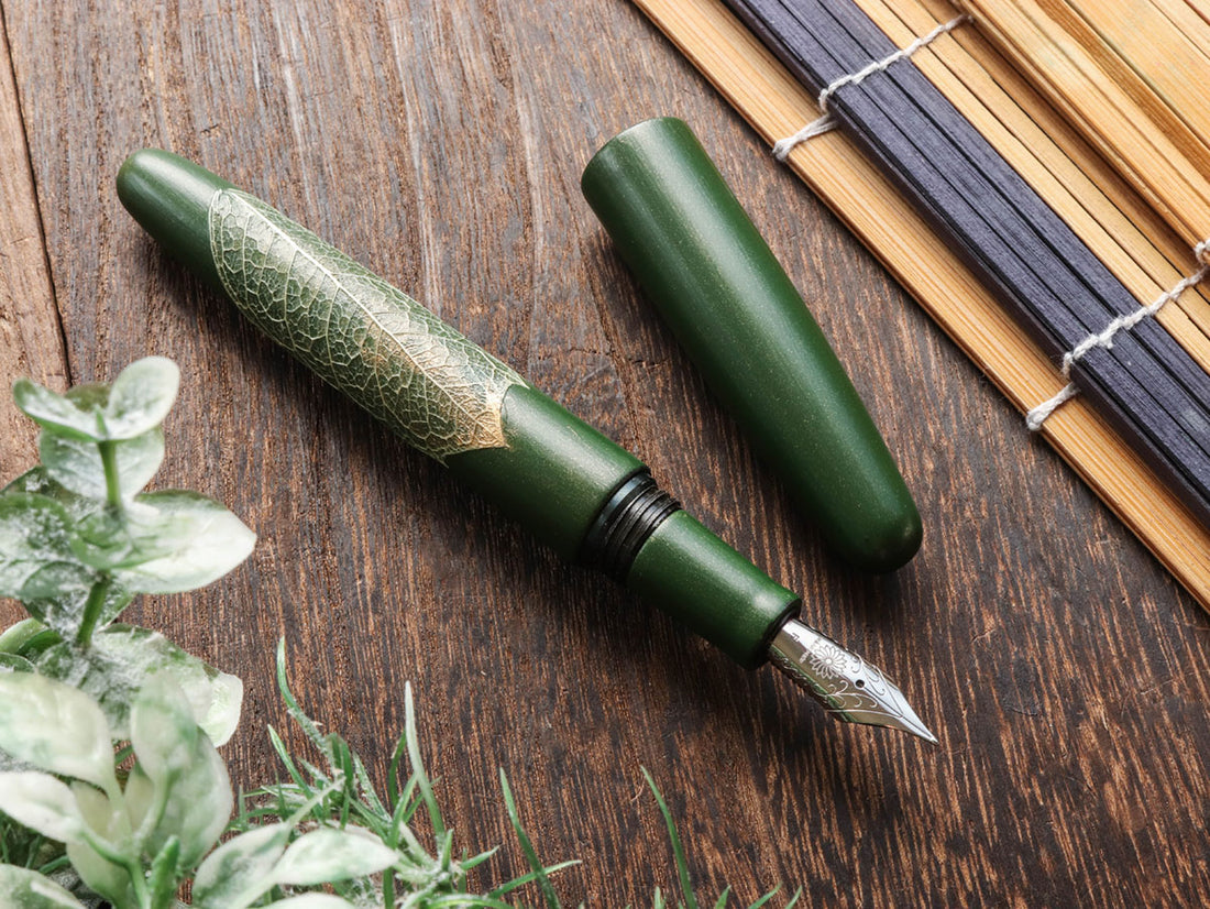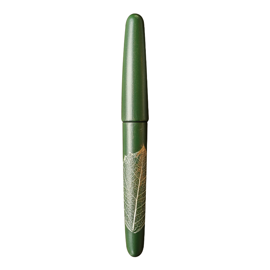 Dream Pen Kiei fountain pen is handmade on the base of Japanese ebonite. On top of that, there are natural urushi, matt urushi, natural leaves and gold powder used to complete this artwork. All materials are carefully made or sourced in Japan.