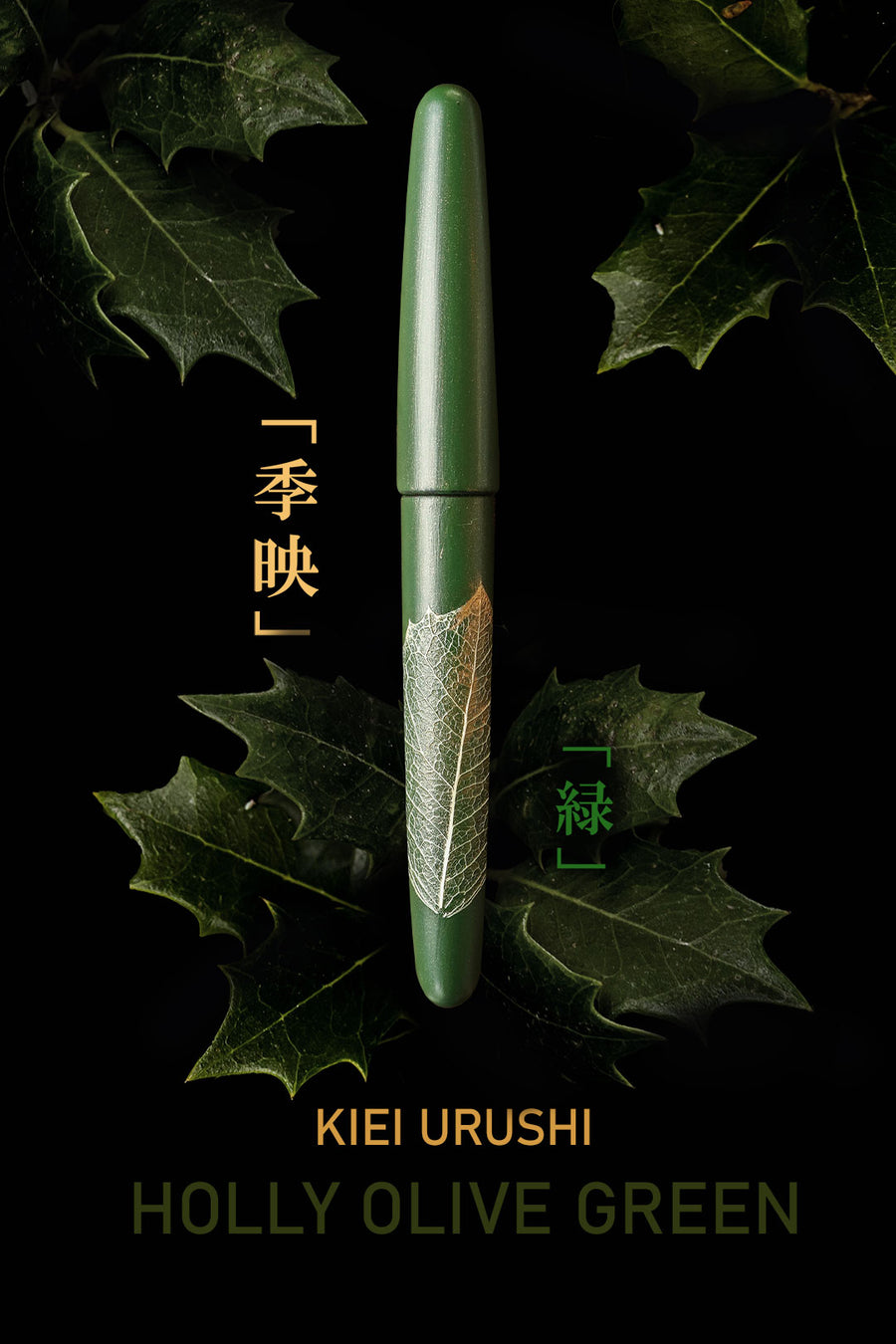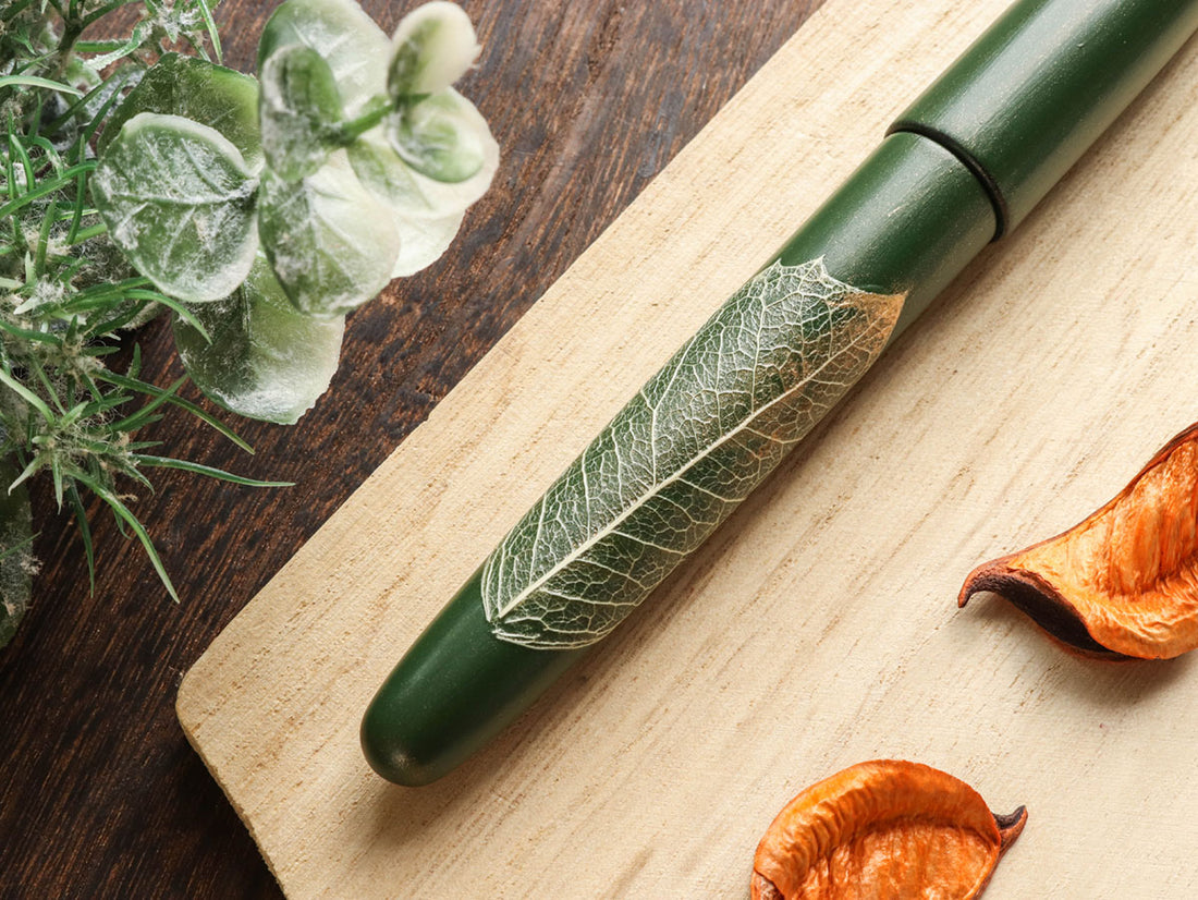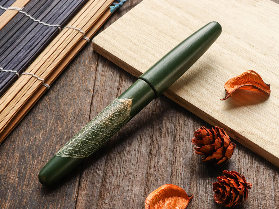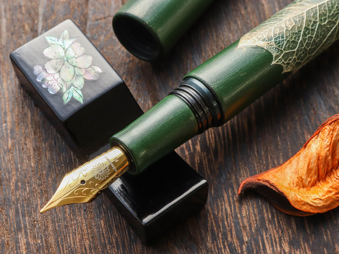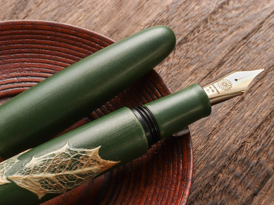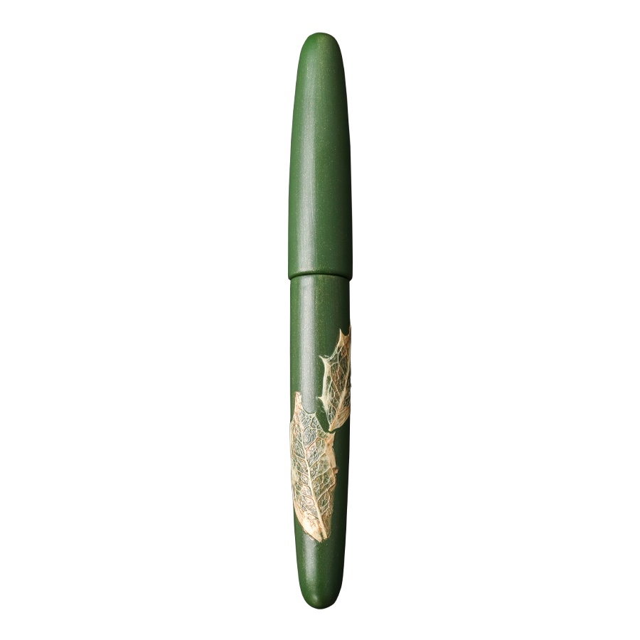 Dream Pen Kiei fountain pen is handmade on the base of Japanese ebonite. On top of that, there are natural urushi, matt urushi, natural leaves and gold powder used to complete this artwork. All materials are carefully made or sourced in Japan.