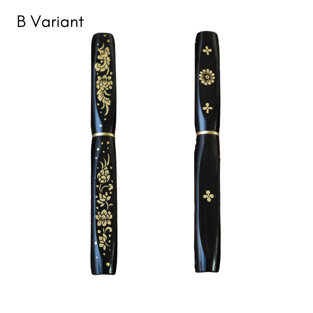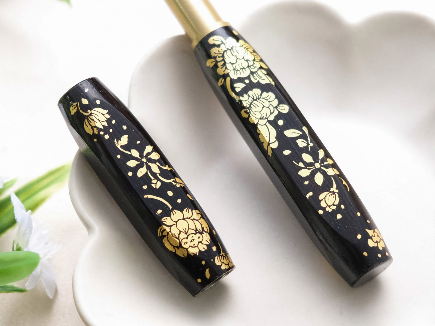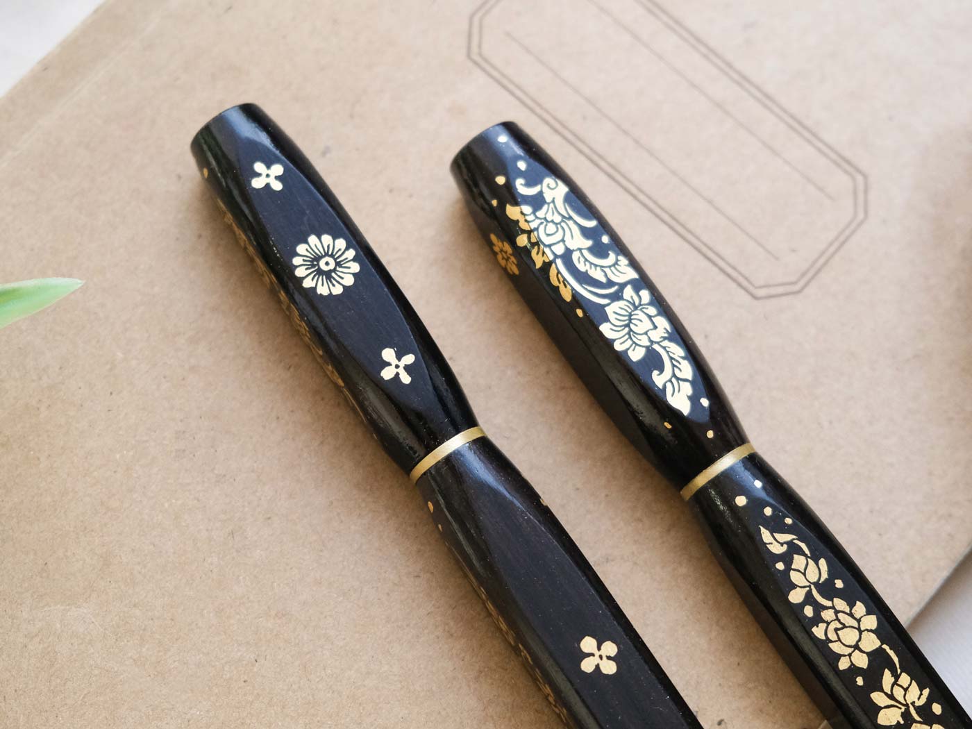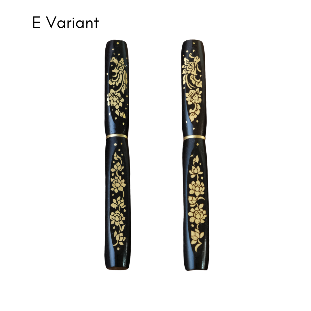 Thai Lacquer Art has many unique techniques such as Long Rak Pid Thong, Pradab Krachok, and Khrueang Khoen, but the star of this collection is the Lai Rot Nam Technique. This technique - which loosely translates to Gilded Black Lacquer - is the art of applying black lacquer inlaid with gold onto surfaces such as fountain pens and vases. In 2024, you can see many examples of Lai Rot Nam artwork in Buddhist temples and palaces all around the country of Thailand. The technique begins with the application of several coats of black laquer onto the object (in this case, the fountain pen). Afterwards, the artist will be traced into the lacquer, and the rest of the lacquer will be painted using Namya Horadan (liquid mixed with arsenic trisulphide).