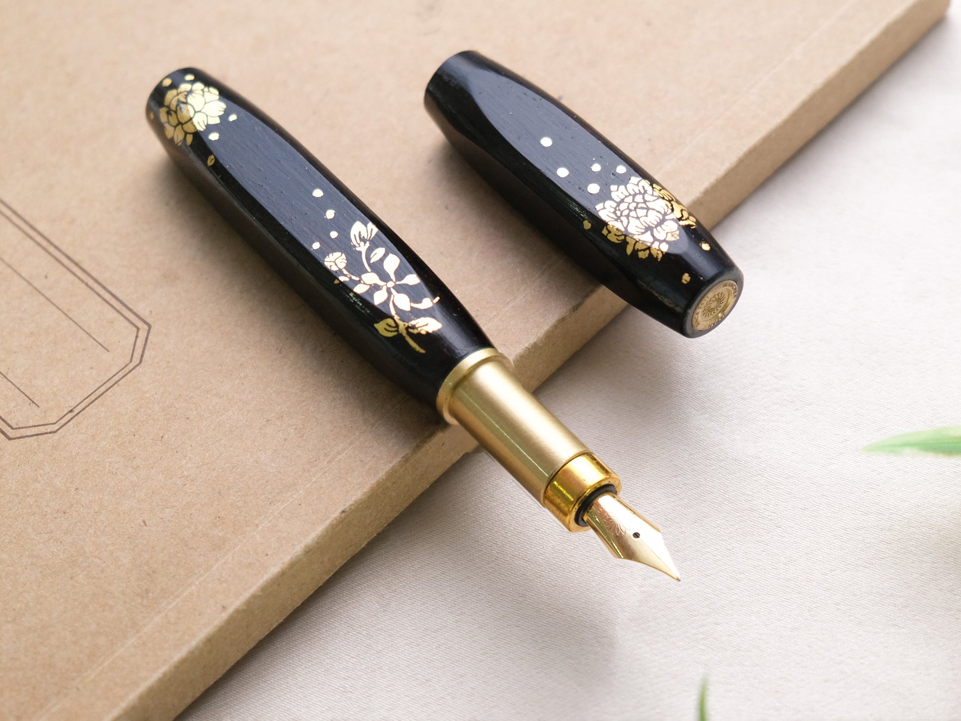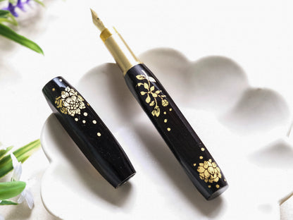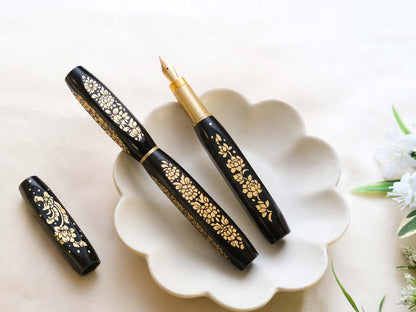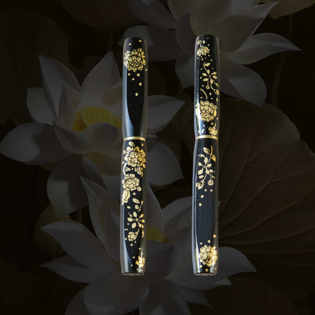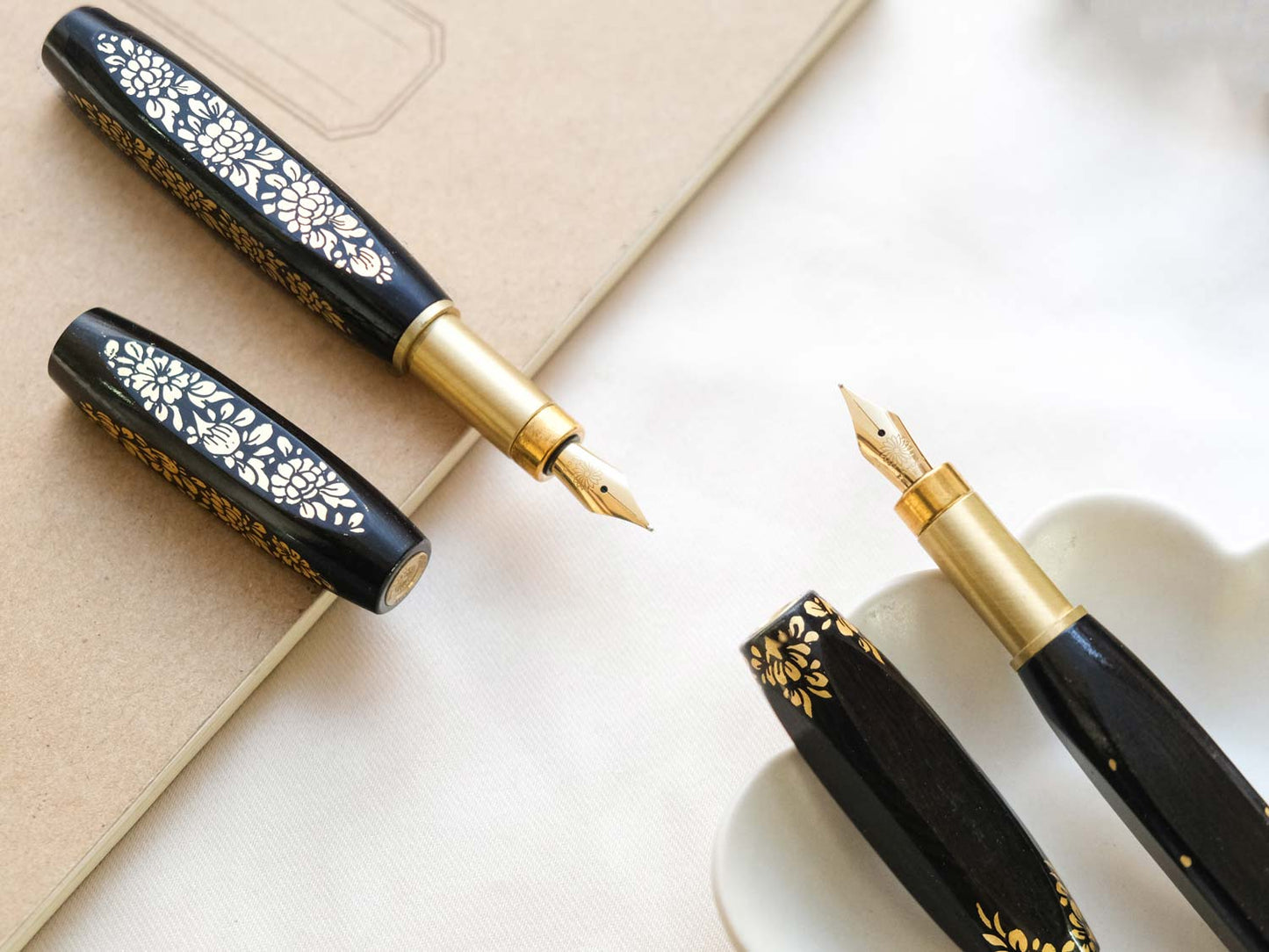 Thai Lacquer Art has many unique techniques such as Long Rak Pid Thong, Pradab Krachok, and Khrueang Khoen, but the star of this collection is the Lai Rot Nam Technique. This technique - which loosely translates to Gilded Black Lacquer - is the art of applying black lacquer inlaid with gold onto surfaces such as fountain pens and vases. In 2024, you can see many examples of Lai Rot Nam artwork in Buddhist temples and palaces all around the country of Thailand. The technique begins with the application of several coats of black laquer onto the object (in this case, the fountain pen). Afterwards, the artist will be traced into the lacquer, and the rest of the lacquer will be painted using Namya Horadan (liquid mixed with arsenic trisulphide).
