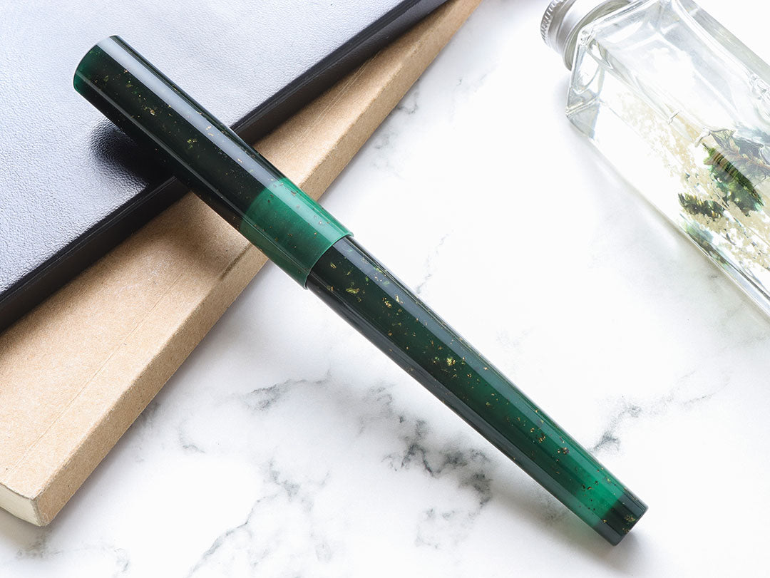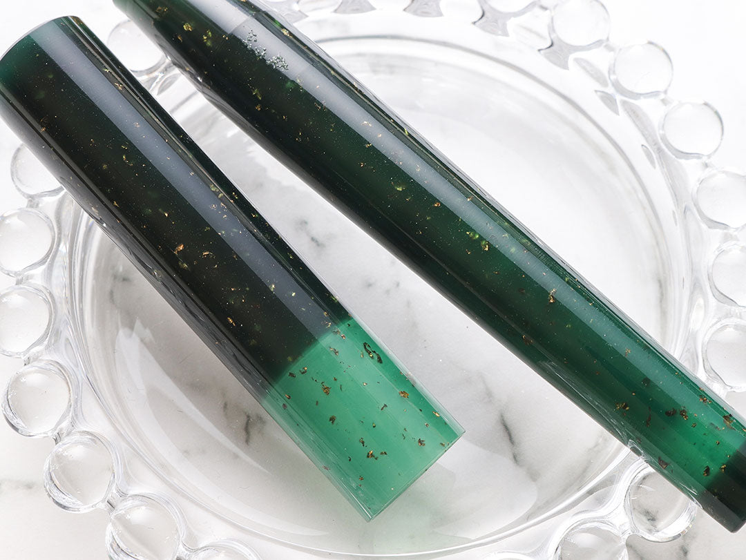 In Greek Mythology, Gaia is the personification of Earth, and she is the Mother of the Gods - the All-Mother. The Shizuku Gaia evokes the ancient imagery of Gaia through the deep green color, representing the natural beauty of nature and the beginning of life on Earth itself. While the glass nib is compatible with converter, the body's shape is different from the rest of the Shizuku collection due to its hard resin material, and thicker circumference. The other pens in the collection represent other planetary bodies, yet the Gaia is special for its committment to the only planet in our solar system conducive to life.