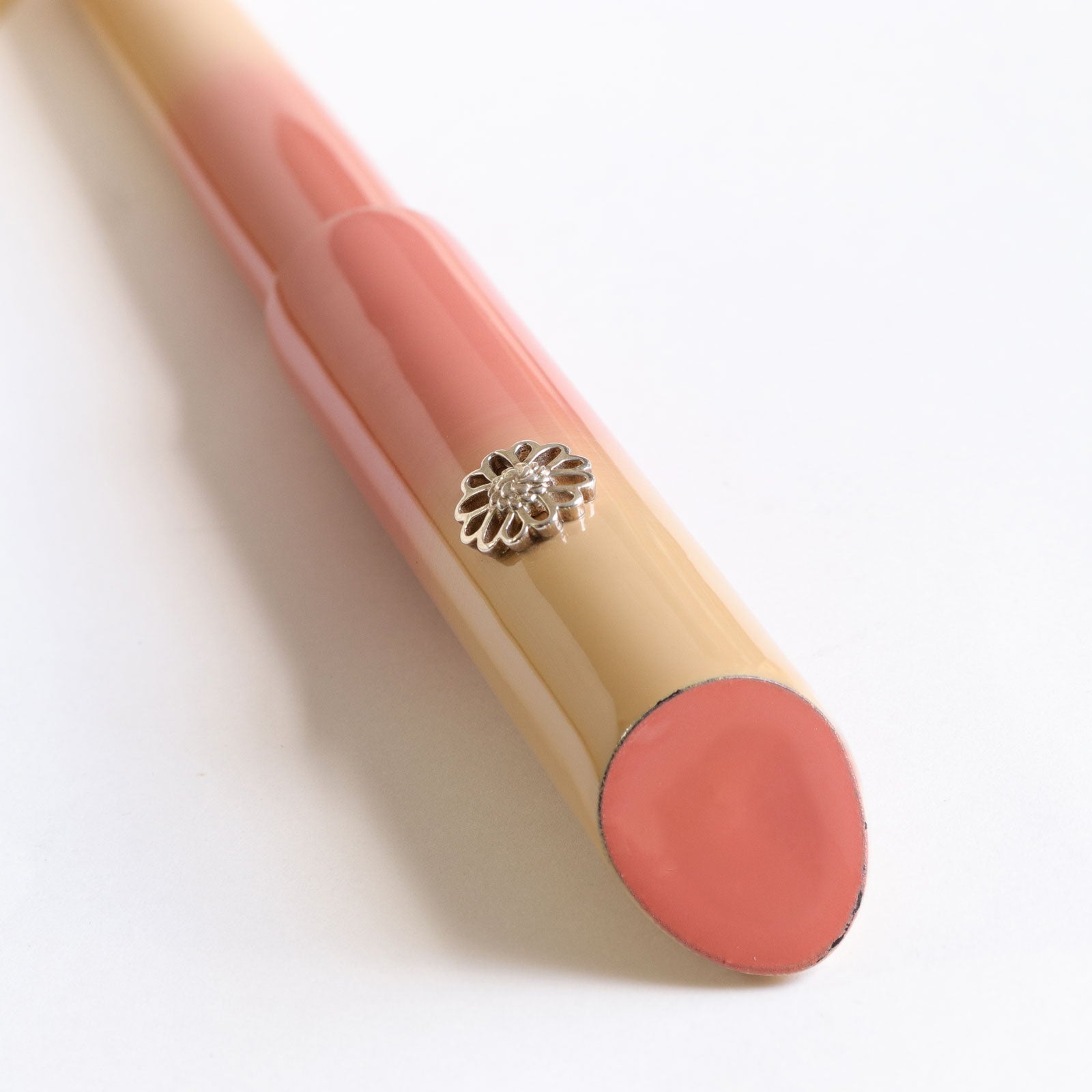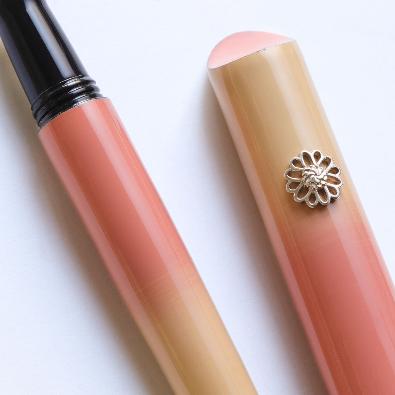 We carefully processed the thought on how to express this shape in a simple way with a fountain pen. We drew a sketch, created a sample design, and decided on ebony wood as the material. For the designs, two types are available: the creamy dark ivory-pink tone and the second one jet black-dark purple tone which are both applied using the advanced Bokashi-nuri technique. Bokashi Nuri is a high skill lacquering technique that requires many years to master.