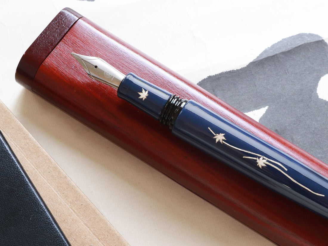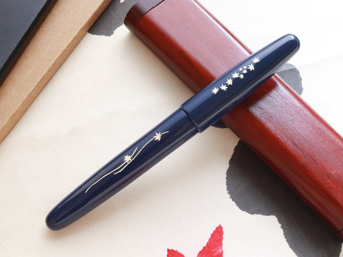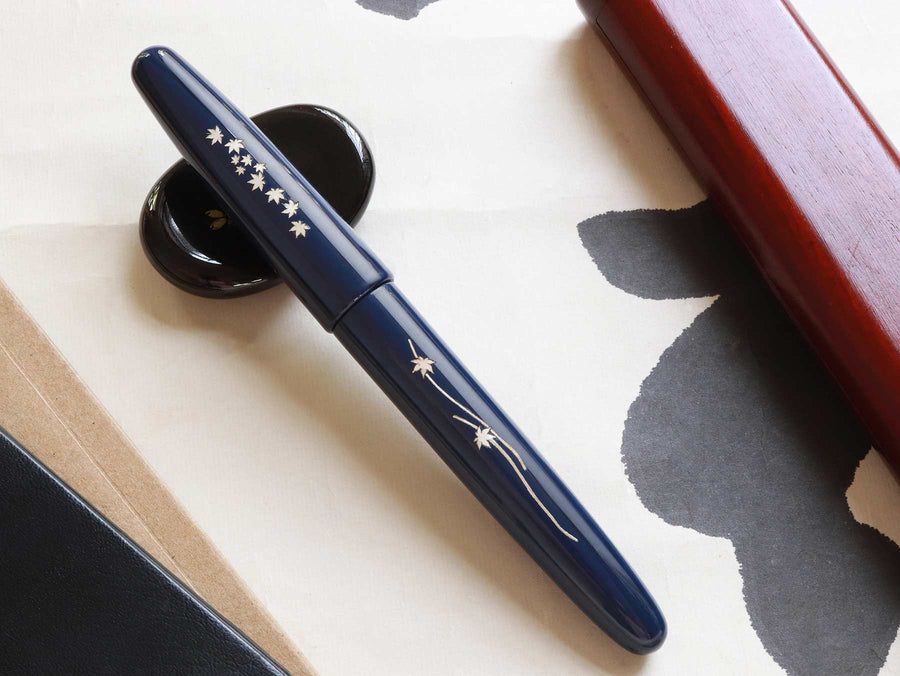 Inspired by beautiful scenes of falling leaves in Japan during Autumn, Dream Pen Zogan Momiji features the image of Japanese traditional symbols Momiji Leaves by inlaying mother of pearl onto the ebonite pen body.
